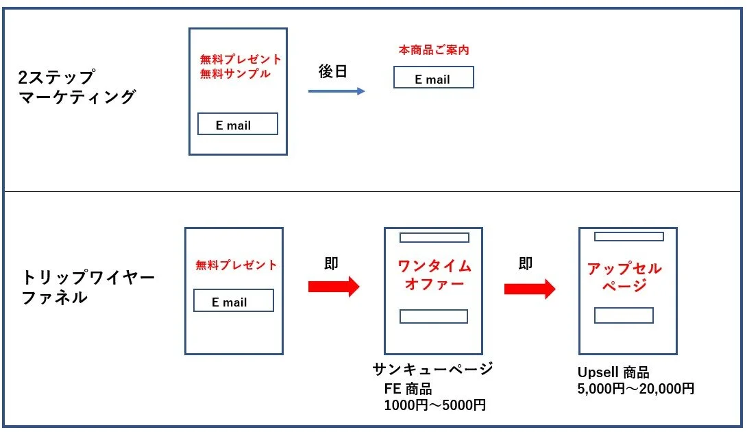 トリップワイヤーと従来の2ステップマーケティングとやり方と大きく違う点は 2ステップマーケティングでは無料プレゼントに応募してくれた人に対して