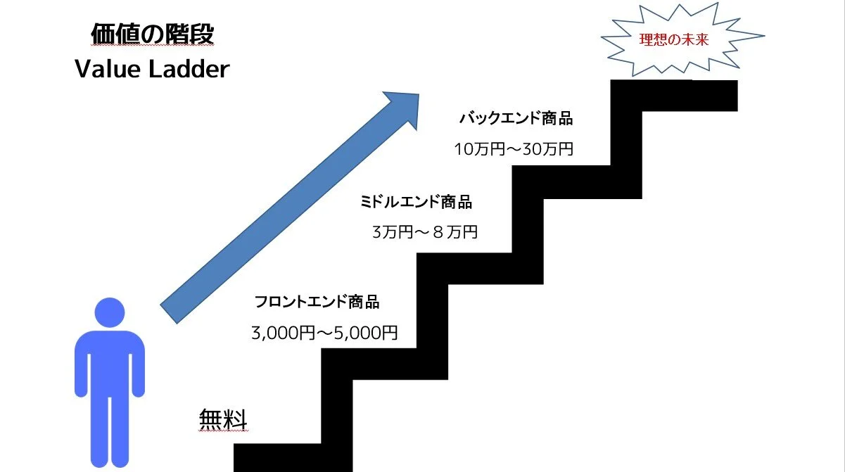 ビジネスを拡大させるためには、集客用商品⇒収益商品 バックエンド商品が必要なわけですが、それは価値の階段を作る方法が最もスムーズにお客様をバックエンド商品にまで誘導できます。